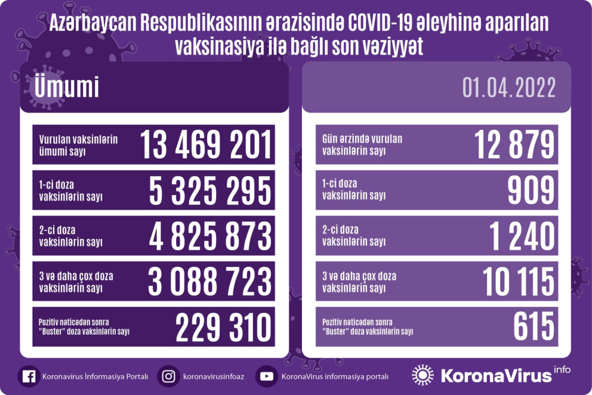 Azərbaycanda son sutkada koronavirus (COVID-19) əleyhinə 12 879 vaksin vurulub. Bir gündə birinci mərhələ üzrə vaksinasiya olunanların sayı 909, ikinci mərhələ üzrə vaksinasiya olunanların sayı 1240, üç və daha çox doza vaksin vurduranların sayı 10 115, pozitiv nəticədən sonra buster doza üzrə vaksinasiya olunanların sayı isə 615 nəfərdir.
