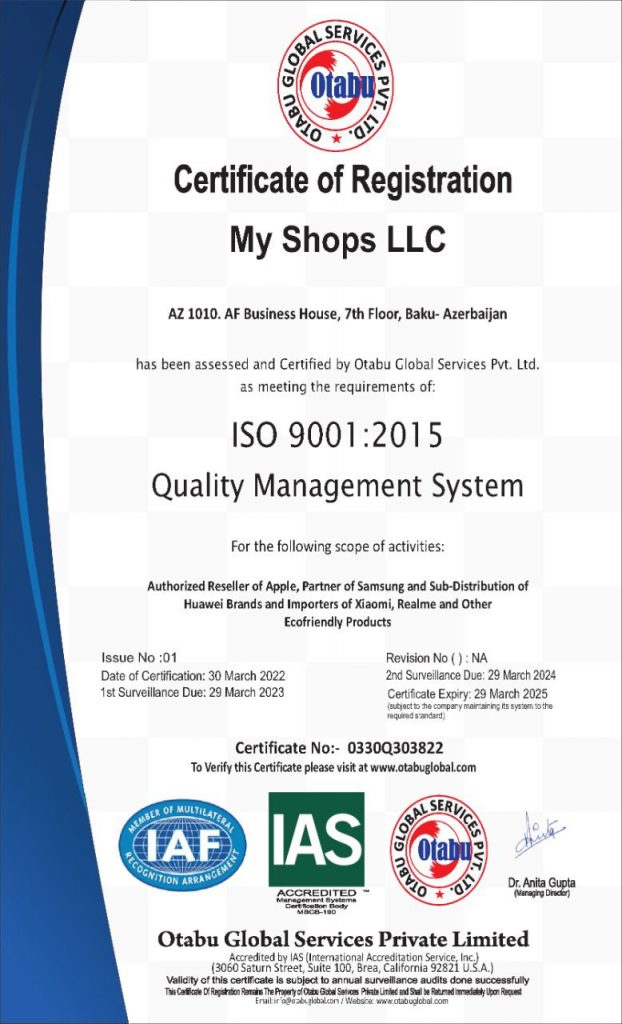 2017-ci ildən fəaliyyət göstərən, qısa müddətdə uzun uğur yolu qət etməyi bacaran, MyShops şirkəti də Keyfiyyətin İdarəedilməsi Sertifikati (İSO) ilə təltif olunub.ISO 9001 dünyada ən populyar standartdır, onun əsasında daha bir sertifikatlaşdırma imkanı olan bir təşkilatda keyfiyyət idarəetmə sistemi (QMS) yaradılır.