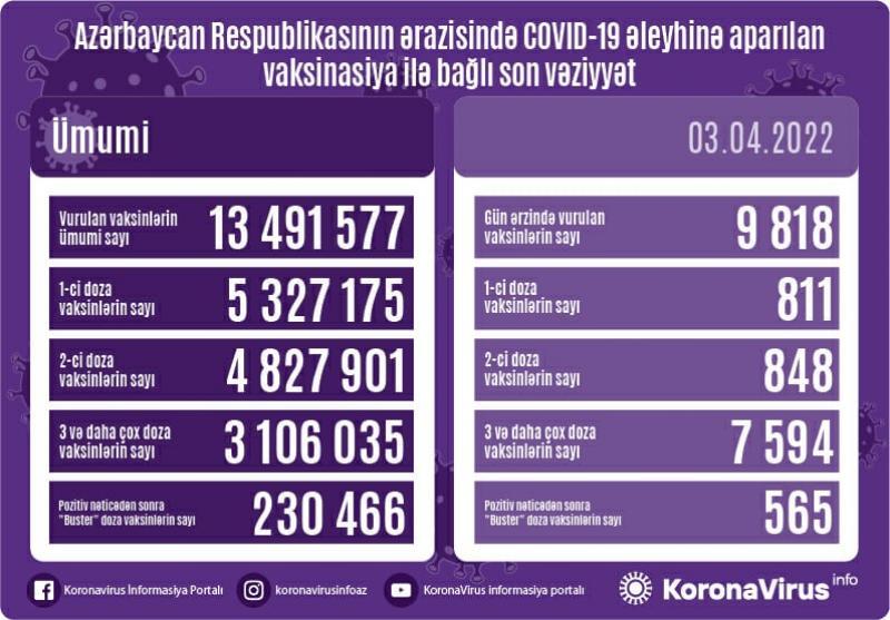 Azərbaycanda son sutkada koronavirus (COVID-19) əleyhinə 9 818 vaksin vurulub. Bir gündə birinci mərhələ üzrə vaksinasiya olunanların sayı 811, ikinci mərhələ üzrə vaksinasiya olunanların sayı 848, 3-cü və daha çox doza üzrə vaksinasiya olunanların sayı 7 594, pozitiv nəticədən sonra buster doza olunanların sayı isə 565 nəfərdir.