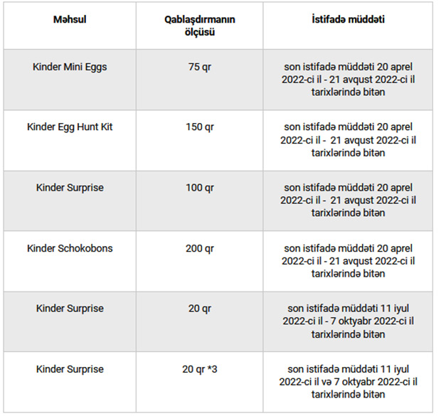 Uşaqlar "Kinder" məhsullarından zəhərlərnib.İngiltərənin Qida Standartları və İrlandiyanın Qida Təhlükəsizliyi agentliklərinin yaydıqları rəsmi məlumatlara əsasən, İtaliyanın “Ferrero” şirkəti Belçikada yerləşən müəssisəsində istehsal olunan, son istifadə müddəti məhsulun çeşidinə uyğun olaraq 20 aprel-21 avqust, habelə 11 iyul-7 oktyabr 2022-ci il tarixləri olan aşağıdakı cədvəldə qeyd edilən məhsullarında salmonella olması ehtimalını nəzərə alaraq, həmin məhsul partiyalarının əsas satış ölkələri olan İngiltərə, İrlandiya, Almaniya, İsveç, Fransadan geri çağırılmasına dair qərar qəbul etmişdir.