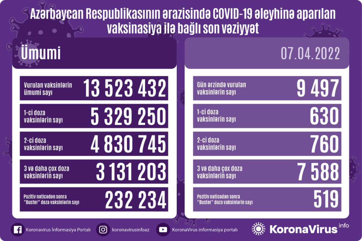 Azərbaycanda son sutkada koronavirus (COVID-19) əleyhinə 9497 vaksin vurulub. Bir gündə birinci mərhələ üzrə vaksinasiya olunanların sayı 630, ikinci mərhələ üzrə vaksinasiya olunanların sayı 760, 3-cü və daha çox doza üzrə vaksinasiya olunanların sayı 7588, pozitiv nəticədən sonra buster doza olunanların sayı isə 519 nəfərdir.