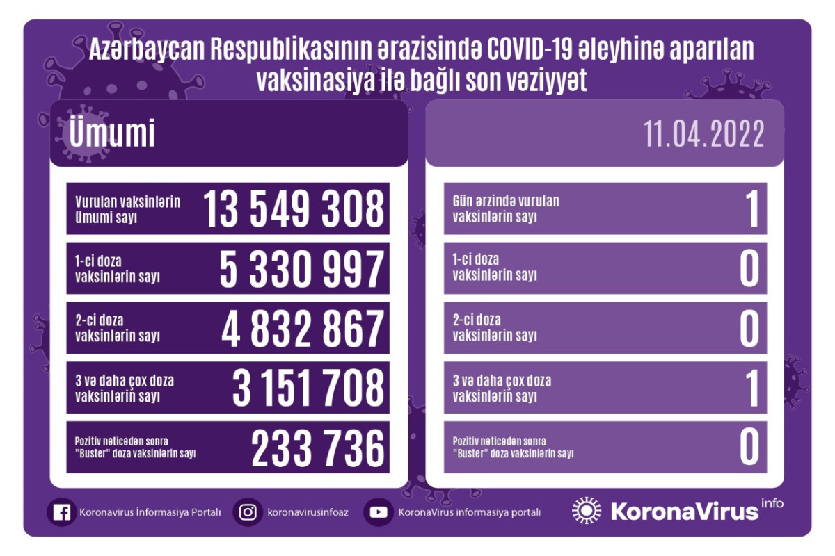 Azərbaycanda son sutkada koronavirus (COVID-19) əleyhinə 1 vaksin vurulub. Bir gündə birinci mərhələ üzrə vaksinasiya olunanların sayı 0, ikinci mərhələ üzrə vaksinasiya olunanların sayı 0, üç və daha çox doza üzrə vaksinasiya olunanların sayı 1, pozitiv nəticədən sonra buster doza olunanların sayı isə 0 nəfərdir.