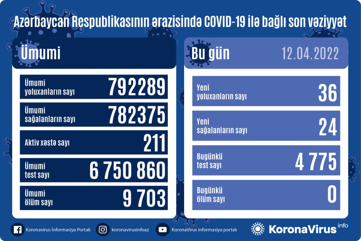 Azərbaycanda koronavirus (COVID-19) infeksiyasına 36 yeni yoluxma faktı qeydə alınıb, 24 nəfər müalicə olunaraq sağalıb.