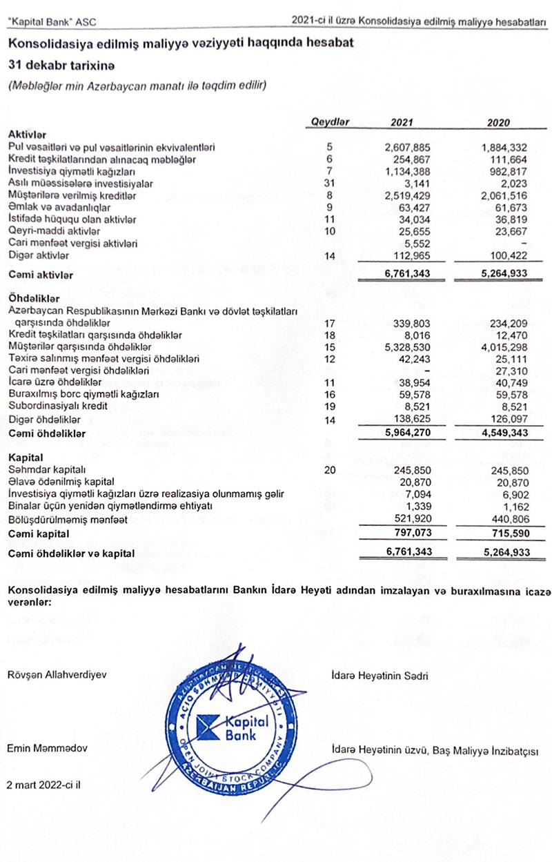 “Kapital Bank” ASC 31 dekabr 2021-ci il tarixində başa çatan il üzrə müstəqil auditorun hesabatı ilə birlikdə konsolidasiya edilmiş maliyyə hesabatlarını dərc edib.