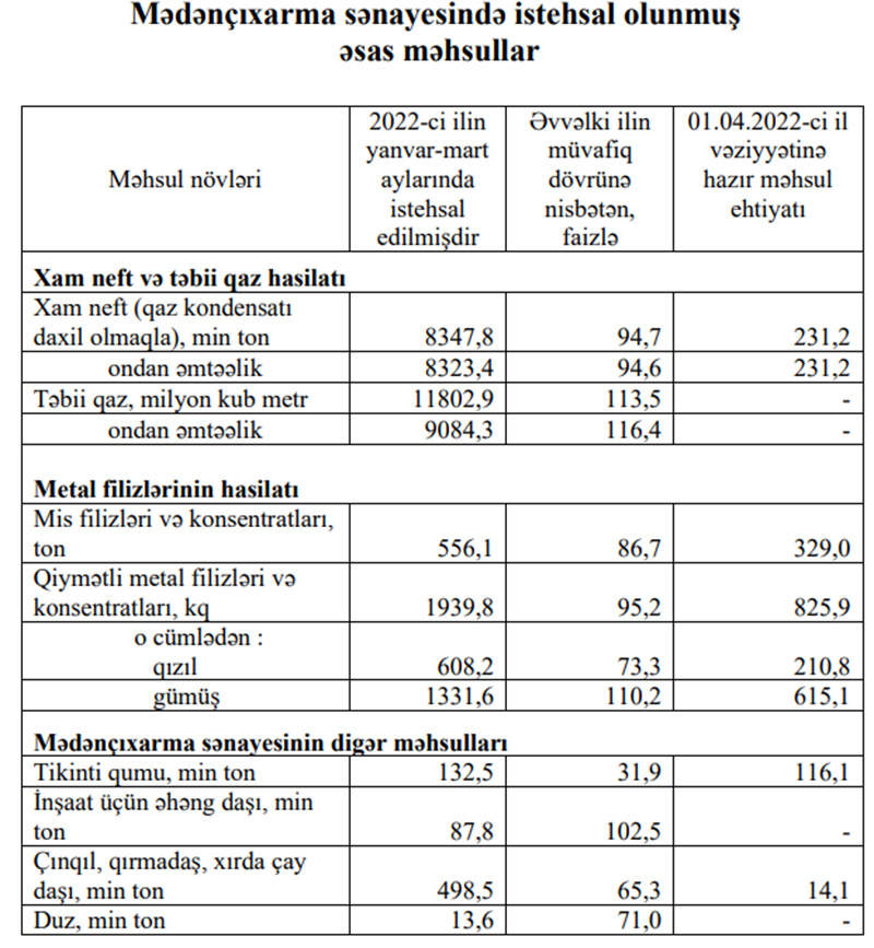 Azərbaycanda qızıl istehsalı 2022-ci ilin yanvar-mart aylarında əvvəlki ilin müvafiq dövrünə nisbətən 26,7 faiz azalaraq 608,2 kq təşkil edib. 01.04.2022-ci il vəziyyətinə hazır məhsul ehtiyatı 210,8 kq olub.