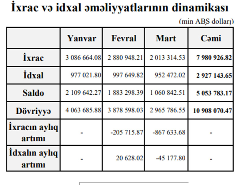 Marja.az Dövlət Gömrük Komitəsinə itinadən xəbər verir ki, idxal 2 milyard 927 milyon 144 min ABŞ dolları, ixrac isə 7 milyard 980 milyon 927 min ABŞ dolları təşkil edib.