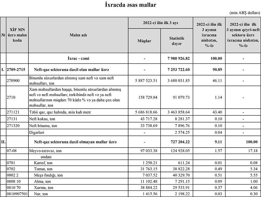Azərbaycaın 7 milyard 980 milyon 927 min dollarlıq ixracının 91%-i neft-qaz sektoruna daxil olan mallar üzrədir.