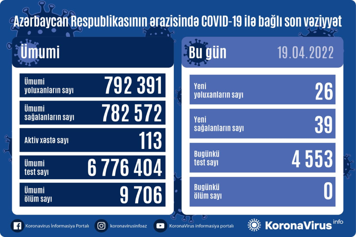 Azərbaycanda koronavirus (COVID-19) infeksiyasına 26 yeni yoluxma faktı qeydə alınıb, 39 nəfər müalicə olunaraq sağalıb.