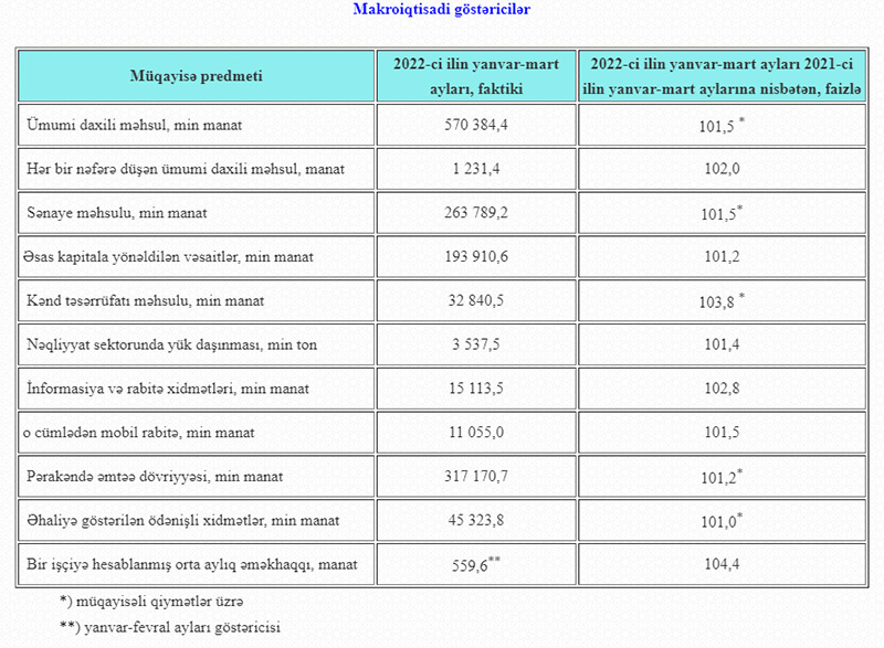 2021-ci ilin müvafiq dövrü ilə müqayisədə 2022-ci ilin ilk rübündə sənaye məhsulu 1,5 faiz, əsas kapitala yönəldilən vəsaitlər 1,2 faiz, kənd təsərrüfatı məhsulu 3,8 faiz, nəqliyyat sektorunda yük daşınması 1,4 faiz, informasiya və rabitə xidmətləri 2,8 faiz artmışdır.