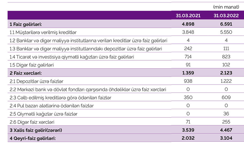 Ümumi gəlirlər 9,6 milyon manat, xərclər 9,4 milyon manat təşkil etmişdir. Birinci rübdə Bank 226,5 min manat həcmində xalis mənfəət əldə edib.