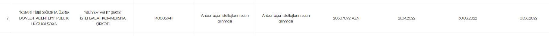 "Əliyev və K" şirkətilə 20 milyon 307 min manatlıq (anbar üçün stellajların satın alınması), "Paşa-K" Firması ilə 623 min 304 manatlıq (Tibb müəssisələrinin istifadəsi üçün spesifik tibbi ləvazimat və sərfiyyat materiallarının satın alınması), "Avromed Company" şirkətilə 1 milyon 461 min 544 manatlıq (Tibb müəssisələrinin istifadəsi üçün spesifik tibbi ləvazimat və sərfiyyat materiallarının satın alınması) müqavilə imzalanıb.