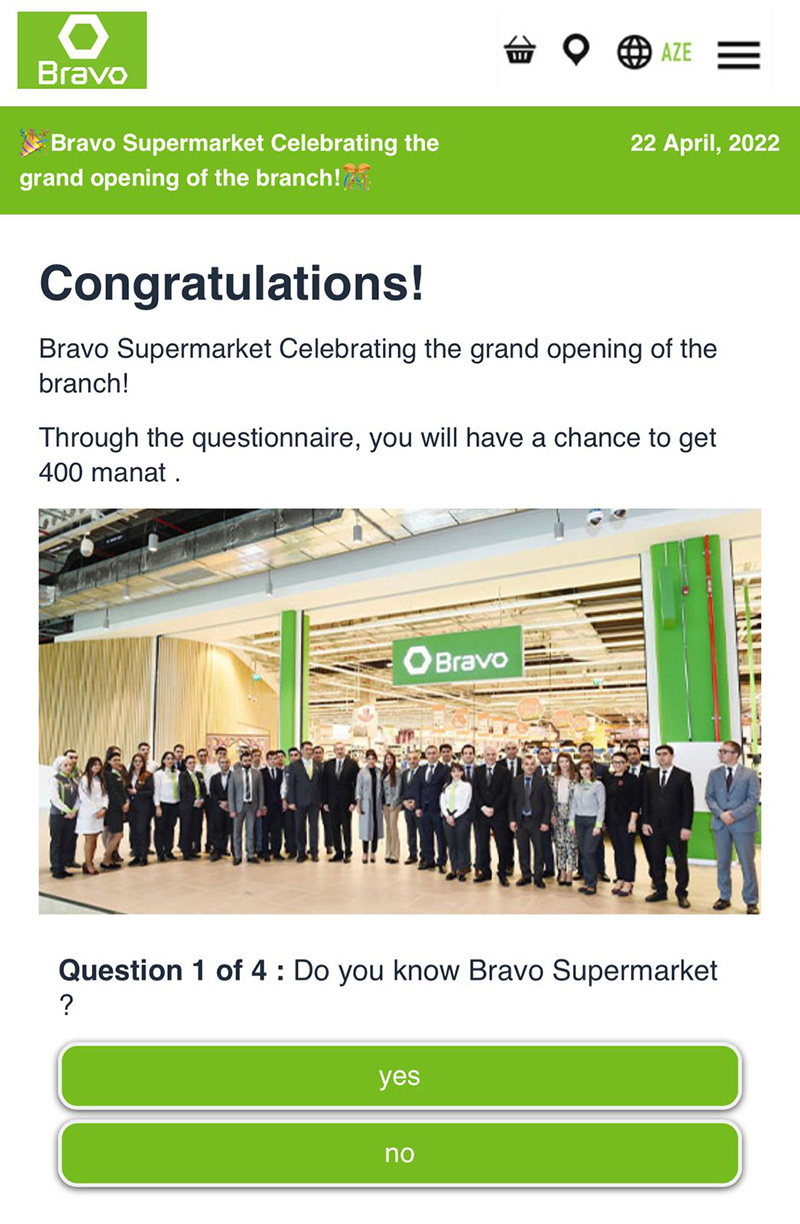 Rəqəmsal İnkişaf və Nəqliyyat Nazirliyinin Mətbuat xidmətinin yaydığı məlumatda bildirilir ki, bu dəfə istifadəçilərə onların fərdi məlumatlarını ələ keçirmək məqsədilə “WhatsApp” üzərindən “Bravo” Marketlər şəbəkəsi adından saxta mesajlar göndərilir. Məlumatda “Bravo”nun yeni filialının açılması münasibətilə 400 manatlıq hədiyyə kuponu vəd olunur və onlardan göndərilən linkə daxil olaraq “sorğu”da iştirak etmələri istənilir.