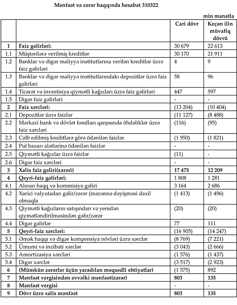 Habelə, 2022-ci ilin birinci rübü ərzində bankın xalis faiz gəlirləri 17.5 milyon manata bərabər olub, bu da ötən ilin analoji dövrü ilə müqayisədə 43% çoxdur.