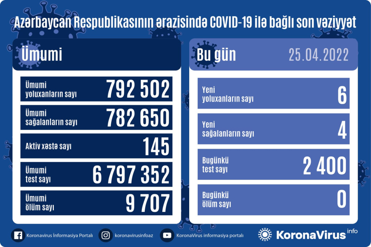 Azərbaycan Respublikasında koronavirus (COVID-19) infeksiyasına 6 yeni yoluxma faktı qeydə alınıb, 4 nəfər müalicə olunaraq sağalıb.