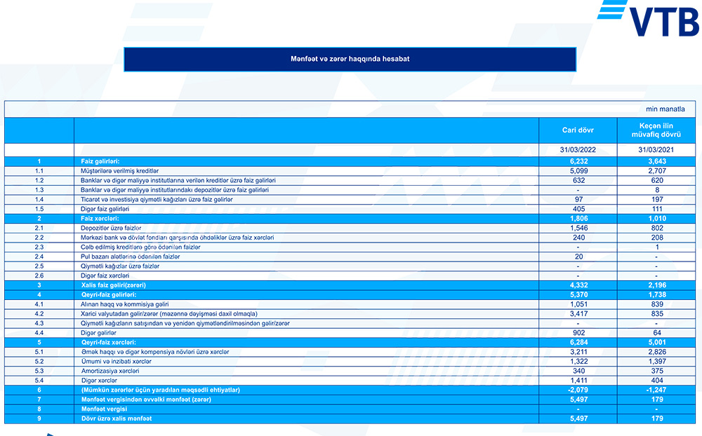 Rusiya bankı VTB-nin Azərbaycandakı törəməsi “Bank VTB Azərbaycan” ASC 2022-ci ilin ilk rübünü (yanvar-mart dövrünü) 5 milyon 497 min manat xalis mənfəət ilə başa vurub. Bank 2021-ci ilin eyni dövrünü 179 min manat xalis mənfəət ilə bağlamışdı. Beləliklə, “Bank VTB Azərbaycan”ın xalis mənfəəti 30,7 dəfə artıb.