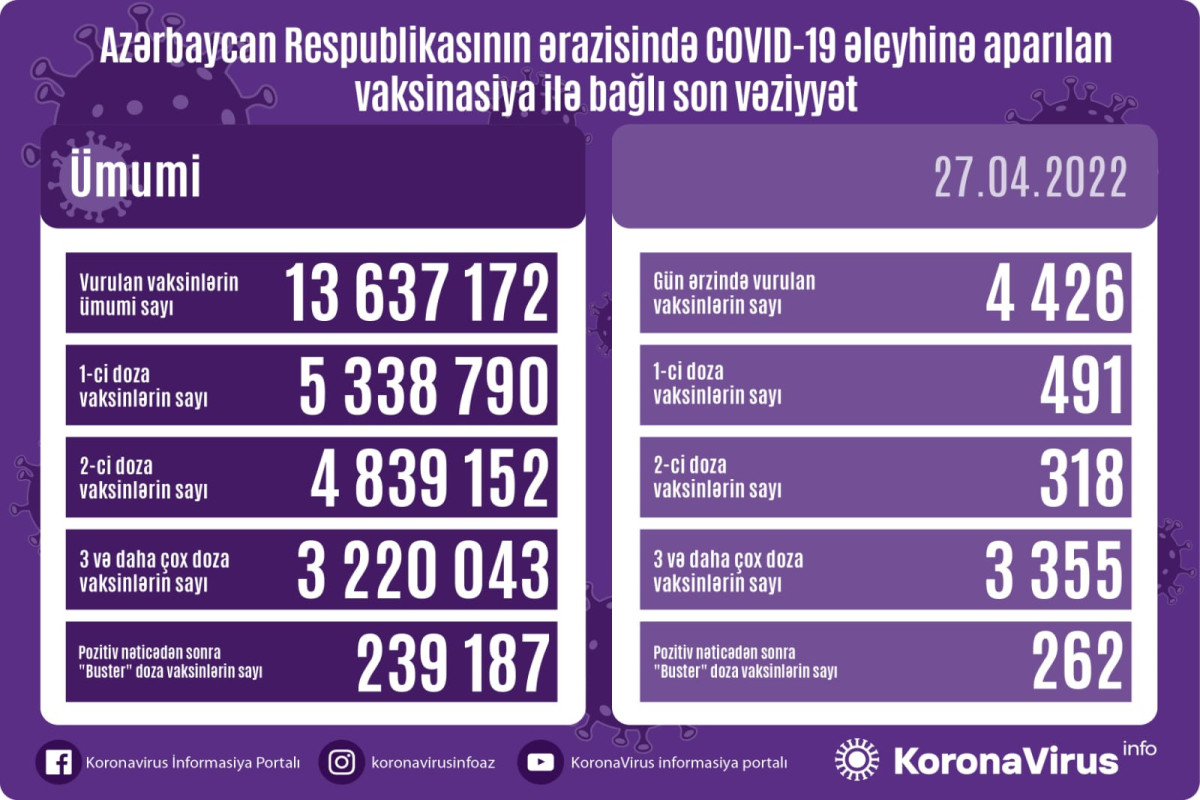Azərbaycanda son sutkada koronavirus (COVID-19) əleyhinə 4426 vaksin vurulub. Bir gündə birinci mərhələ üzrə vaksinasiya olunanların sayı 491, ikinci mərhələ üzrə vaksinasiya olunanların sayı 318, üç və daha çox doza üzrə vaksinasiya olunanların sayı 3355, pozitiv nəticədən sonra buster doza üzrə vaksinasiya olunanların sayı 262 nəfərdir.