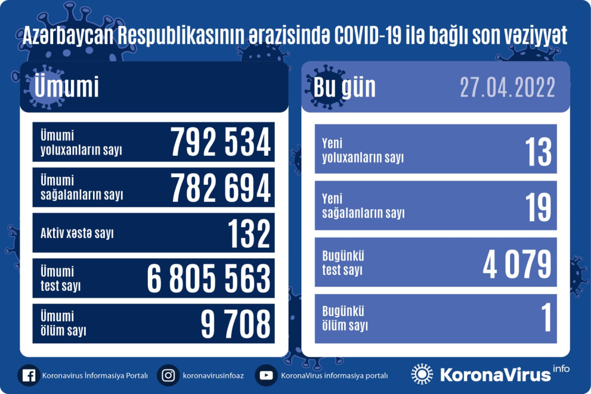Azərbaycan Respublikasında koronavirus (COVID-19) infeksiyasına 13 yeni yoluxma faktı qeydə alınıb, 19 nəfər müalicə olunaraq sağalıb.