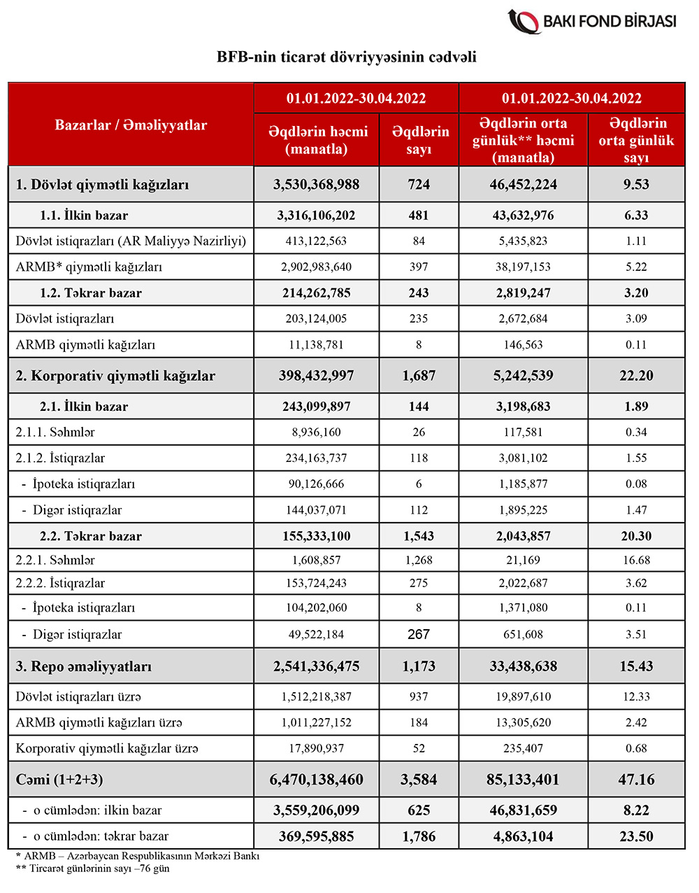 Bakı Fond Birjasında 01.01.2022-30.04.2022 tarixləri ərzində qiymətli kağızlar üzrə keçirilən əməliyyatların ümumi həcmi 6 milyard 470 milyon 138, min manat təşkil etmişdir.