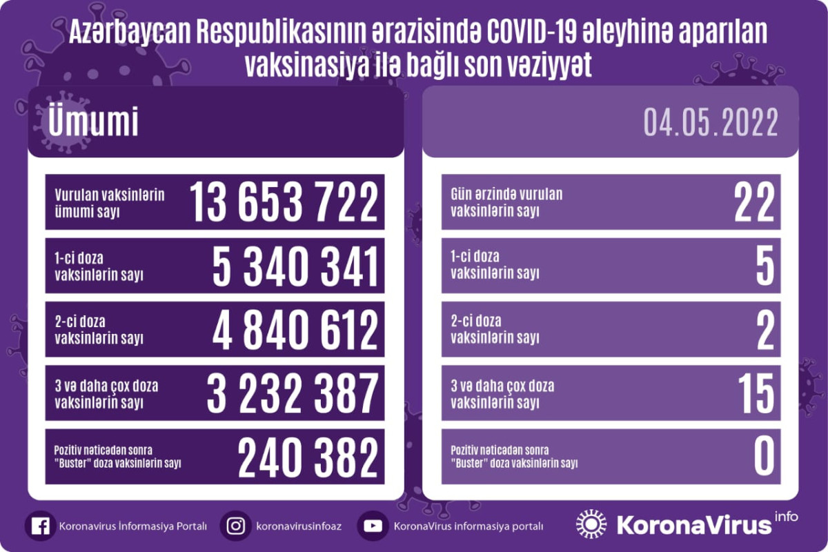 Azərbaycanda son sutkada koronavirus (COVID-19) əleyhinə 22 vaksin vurulub. Bir gündə birinci mərhələ üzrə vaksinasiya olunanların sayı 5, ikinci mərhələ üzrə vaksinasiya olunanların sayı 2, üç və daha çox doza üzrə vaksinasiya olunanların sayı 15, pozitiv nəticədən sonra buster doza üzrə vaksinasiya olunanların sayı 0 nəfərdir.