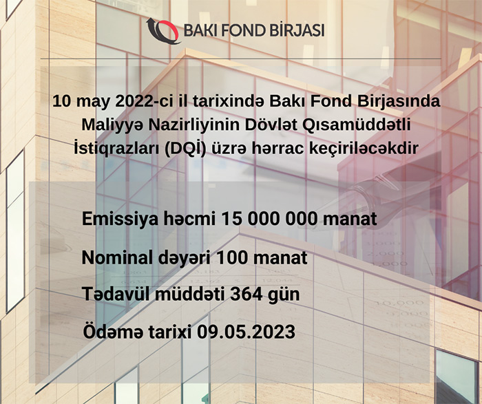10 may 2022-ci il tarixində Bakı Fond Birjasında Maliyyə Nazirliyinin 15 milyon manatlıq Dövlət Qısamüddətli İstiqrazları (DQİ) üzrə hərrac keçiriləcəkdir.