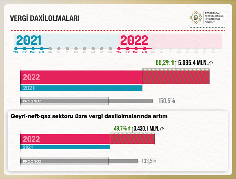 Nazir qeyd edib ki, yanvar-aprel ayları ərzində vergi daxilolmaları ötən ilin eyni dövrü ilə müqayisədə 55,2% artaraq 5 milyard 35,4 milyon manat təşkil edib və proqnoz 150,5% səviyyəsində icra olunub.