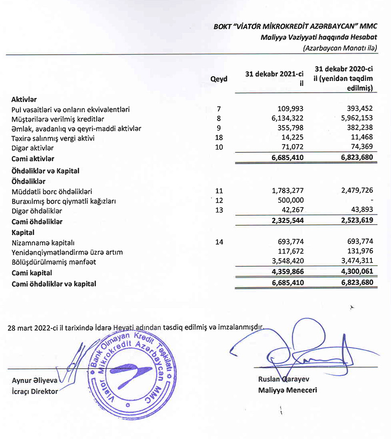 BOKT “Viator Mikrokredit Azərbaycan” MMC 2021-ci ili 132 min manat xalis mənfəət ilə başa vurub. Təşkilat 2020-ci ili 205 min manat xalis mənfəət ilə bağlamışdı. Beləliklə,“Viator Mikrokredit Azərbaycan”ın xalis mənfəəti 2020-ci illə müqayisədə 2021-ci ildə 35,6% azalıb.