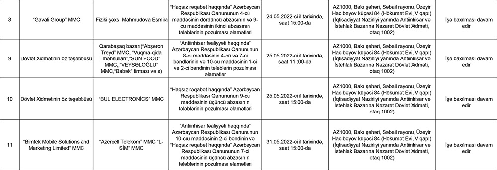 Marja.az Xidmətə istinadən xəbər verir ki, araşdırma zamanı “SUN FOOD” MMC, “Xudafərin-1” MMC, “Qida XXI” MMC, “Elsaan Group” MMC, “VEYSƏLOĞLU” MMC, “Babək” firması və s tərəfindən antiinhisar qanunvericiyilinin pozulması əlamətləri aşkar olunaraq həmin təsərrüfat subyektləri barədə iş qaldırılıb.