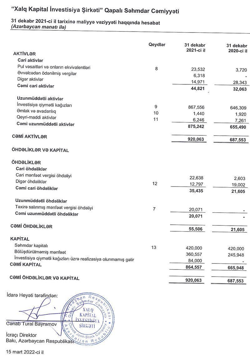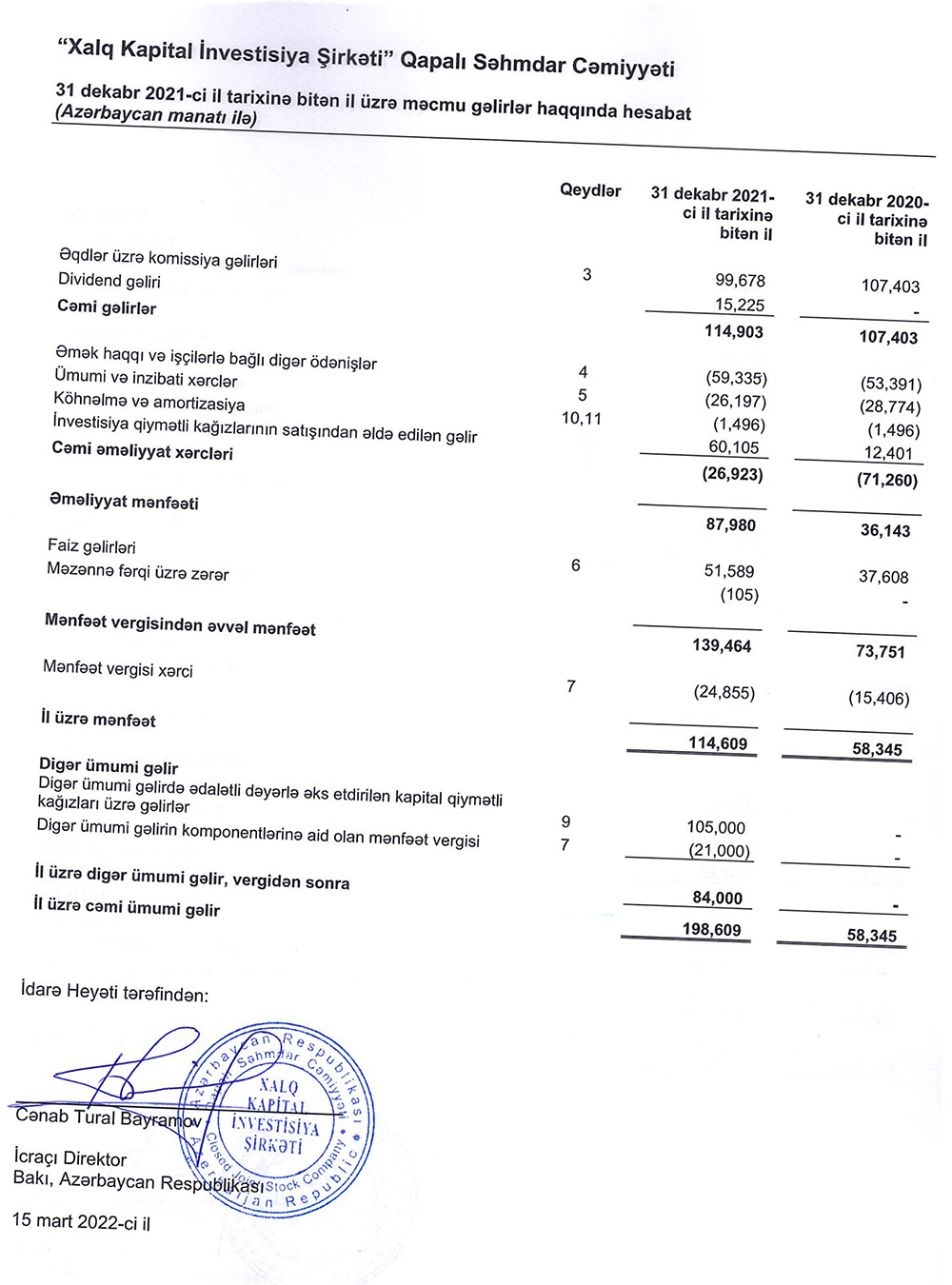 “Xalq Kapital İnvestisiya Şirkəti” QSC 2021-ci ili təxminən 115 min manat xalis mənfəət ilə başa vurub. Halbuki, şirkət 2020-ci ili 58 min manat xlias mənfəət ilə bağlamışdı.