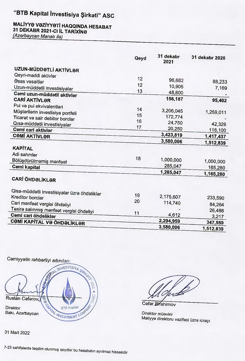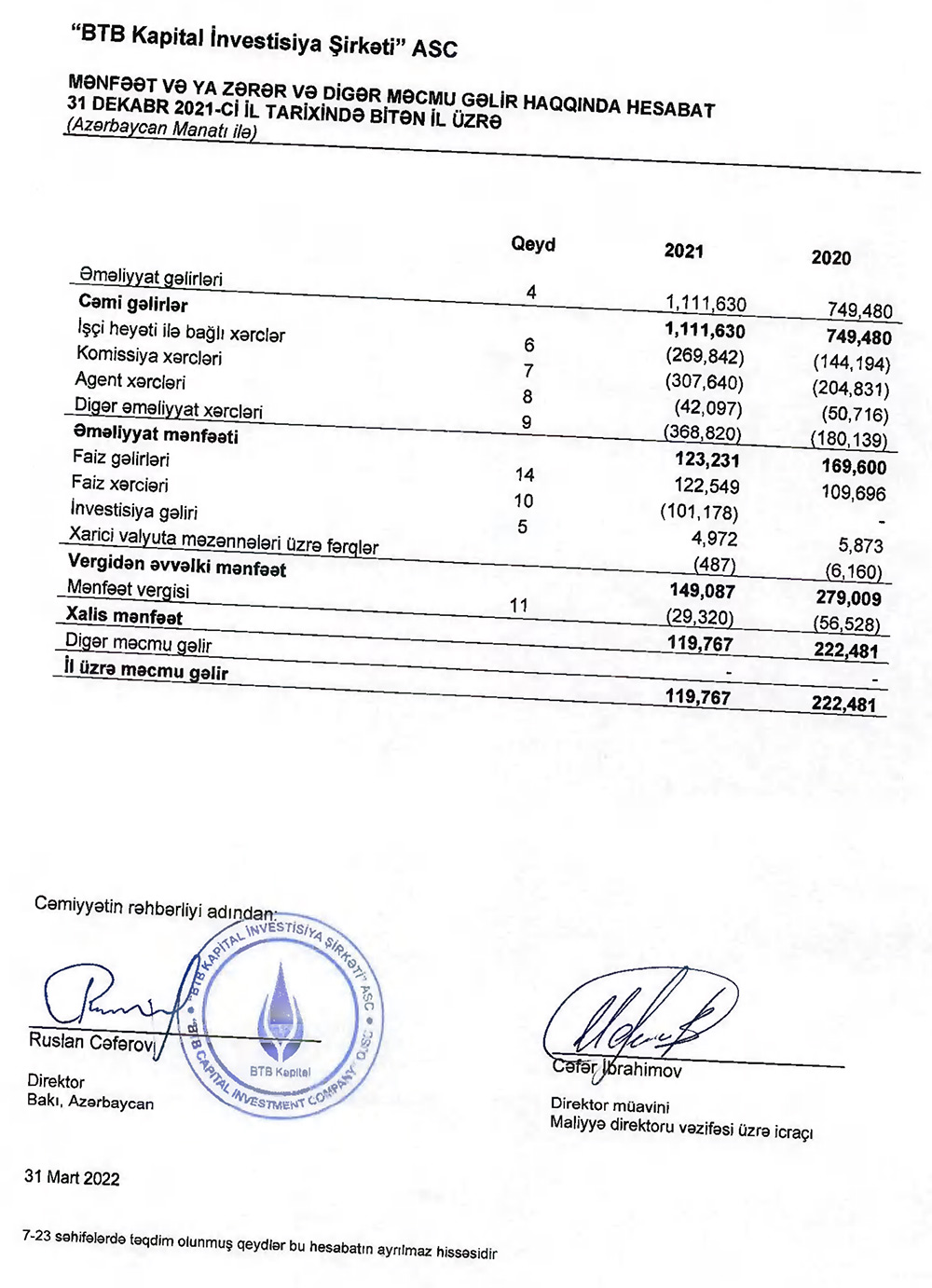 “BTB Kapital İnvestisiya Şirkəti” ASC 2021-ci ili təxminən 120 min manat xalis mənfəət ilə başa vurub. Halbuki, şirkət 2020-ci ili 222 min manat xlias mənfəət ilə bağlamışdı.