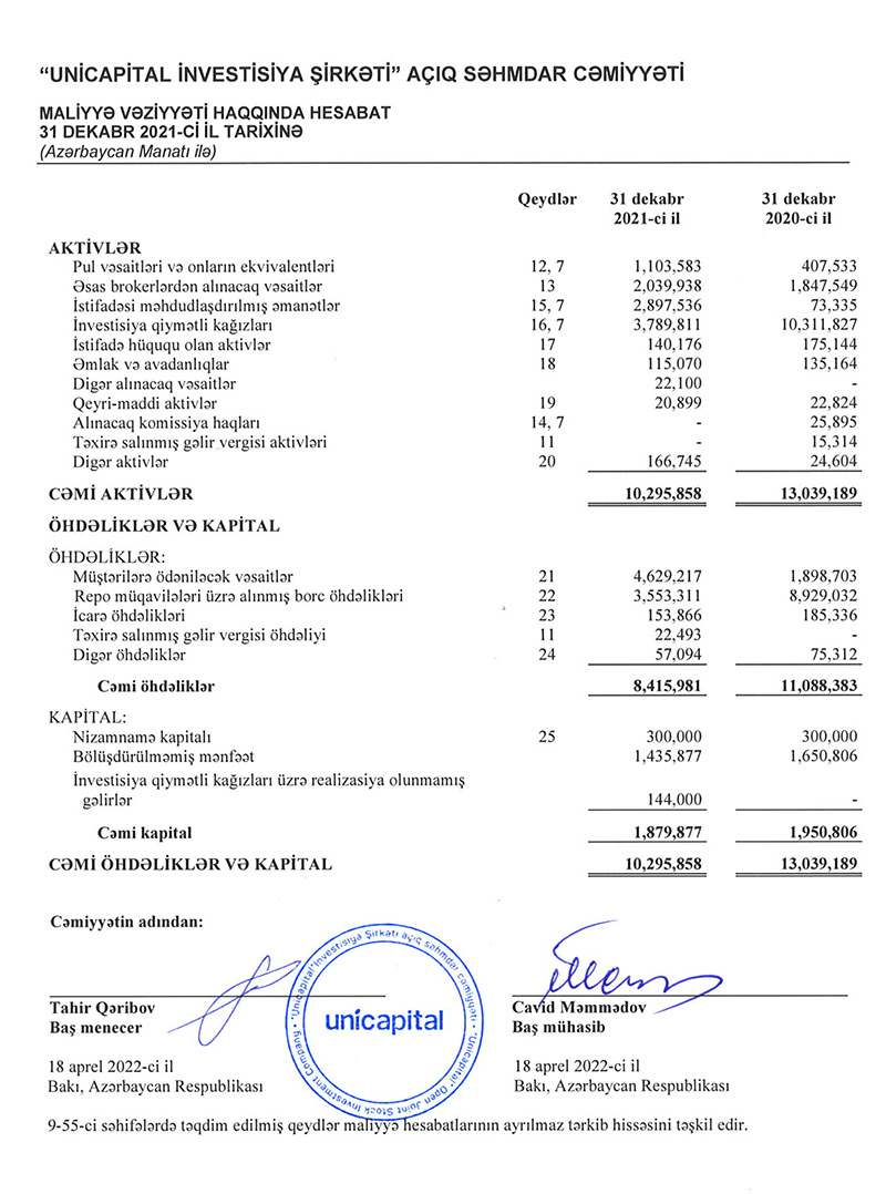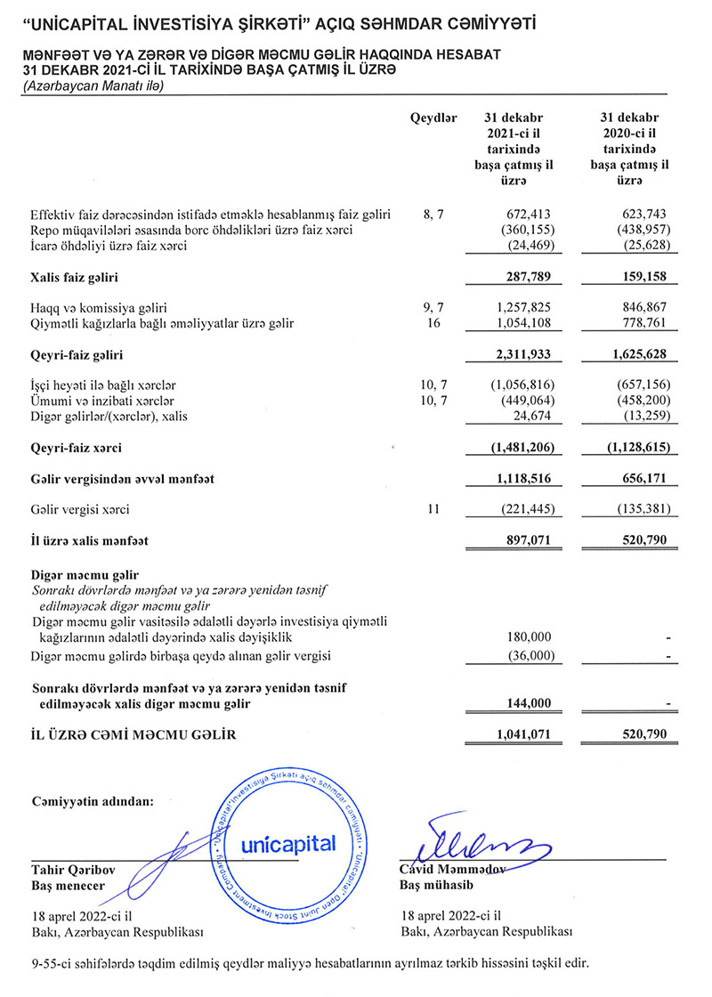 “Unicapital”ın audit təsdiqli illik hesabatına görə, şirkətin 2021-ci il üzrə məcmu gəliri 1 milyon 41 min 71 manat təşkil edib, bu da keçən il ilə müqayisədə 100%-ə yaxın artım deməkdir.