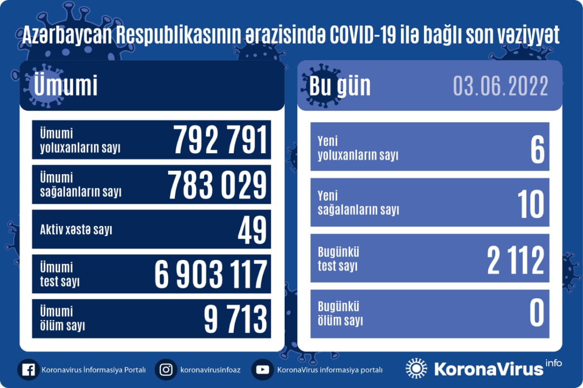 Azərbaycan Respublikasında koronavirus (COVID-19) infeksiyasına 6 yeni yoluxma faktı qeydə alınıb, 10 nəfər müalicə olunaraq sağalıb.