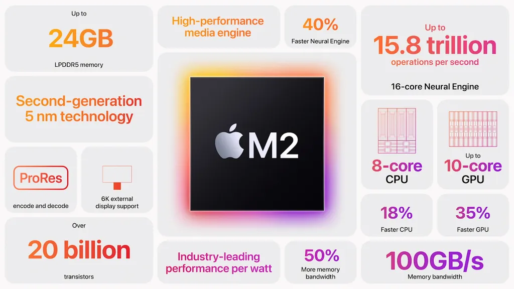 Apple təqdimatda yeni M2 prosessoru haqqında da danışıb. Şirkətin məlumatına görə, o, əvvəlki nəsil çipdən 18% daha sürətlidir. Ötürmə qabiliyyəti 100 GB/s təşkil edir. Bundan əlavə, şirkət MacBook Air noutbukunu yeniləyib və M2-ni ona quraşdırıb. Noutbuk gümüşü, boz, mavi və qızılı rənglərdə təqdim olunub, onun qalınlığı 11,3 mm, displeyin diaqonalı 13,6 düym, kiçildilmiş çərçivələr və alüminium korpusla təchiz edilib.