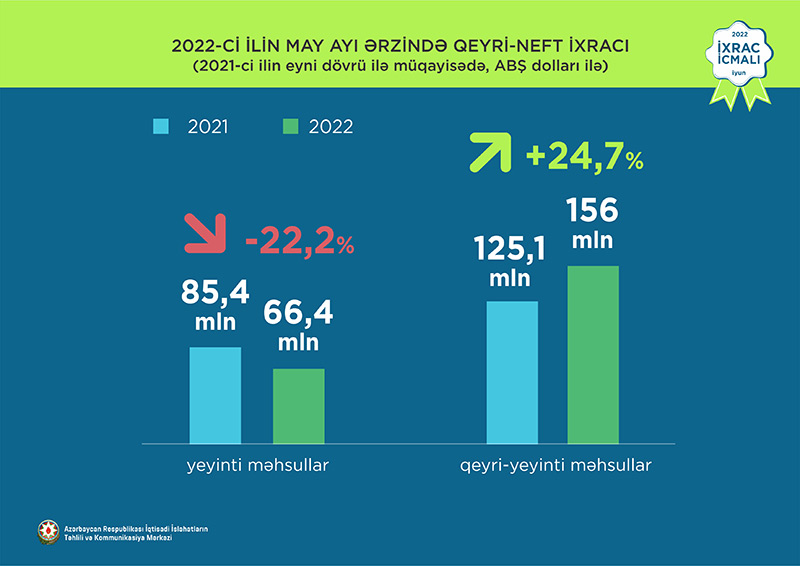2022-ci ilin may ayı üzrə ixrac 3,6 milyard ABŞ dolları təşkil edib. Qeyri-neft sektoru üzrə ixracda artım 5,7% təşkil etməklə 222,4 milyon ABŞ dolları olub. 2022-ci ilin may ayı ərzində yeyinti məhsulları üzrə ixrac 66,4 milyon ABŞ dolları, qeyri-yeyinti məhsulları üzrə isə 24,7% artaraq 156 milyon ABŞ dolları təşkil edib.