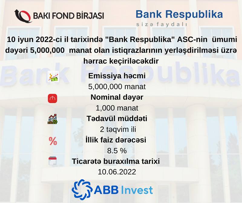 Birjanın yaydığı məlumata görə, 10 iyun 2022-ci il tarixində “Bank Respublika” ASC-nin istiqrazlarının yerləşdirilməsi Bakı Fond Birjasında rəqabətli hərrac üsulu ilə həyata keçiriləcəkdir.