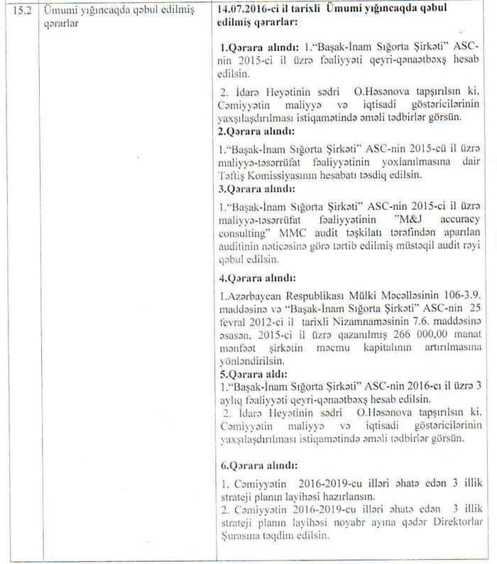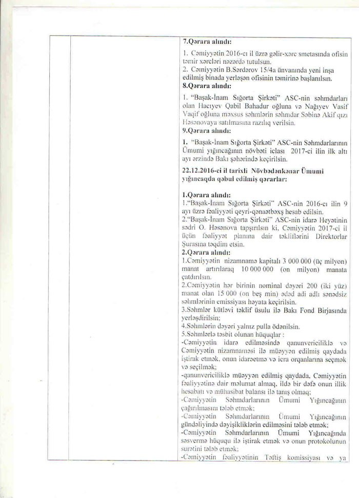 14.09.2017-ci il tarixində “Başak İnam” sığorta şirkətinin səhmdarlarının iclası keçirilmişdi.