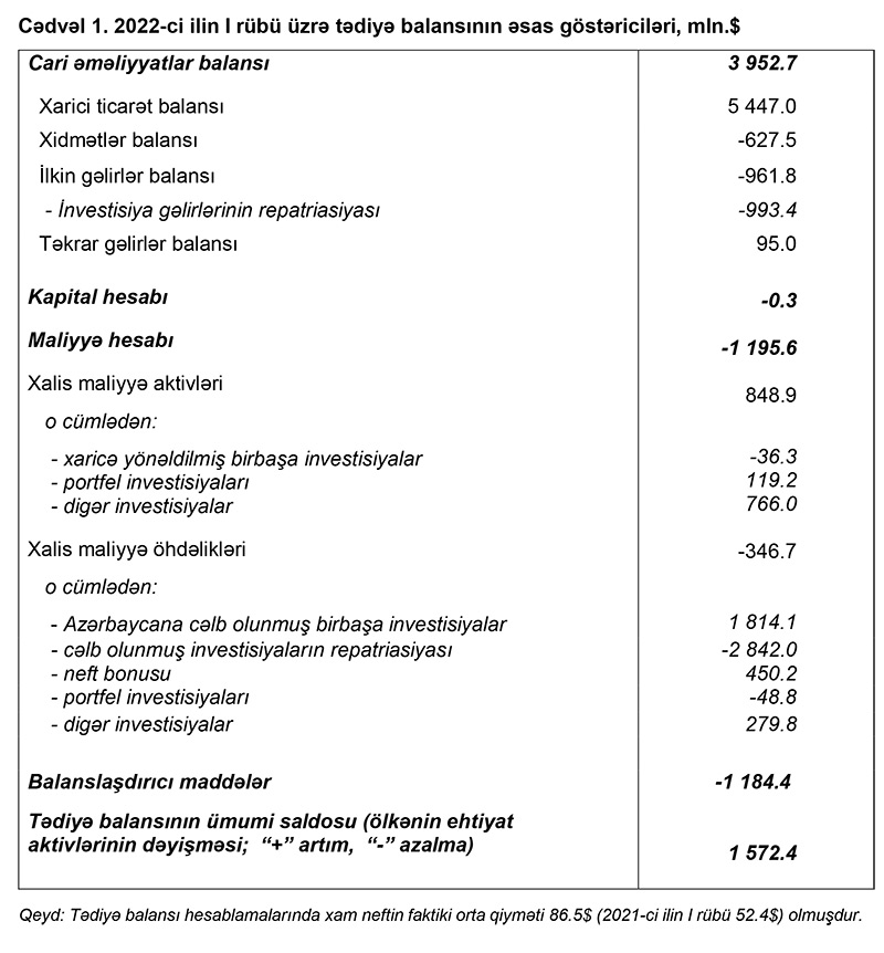 2022-ci ilin 1-ci rübü üzrə Azərbaycanın tədiyyə balansının müsbət saldosu 1 milyard 572 milyon dollar təşkil edib.