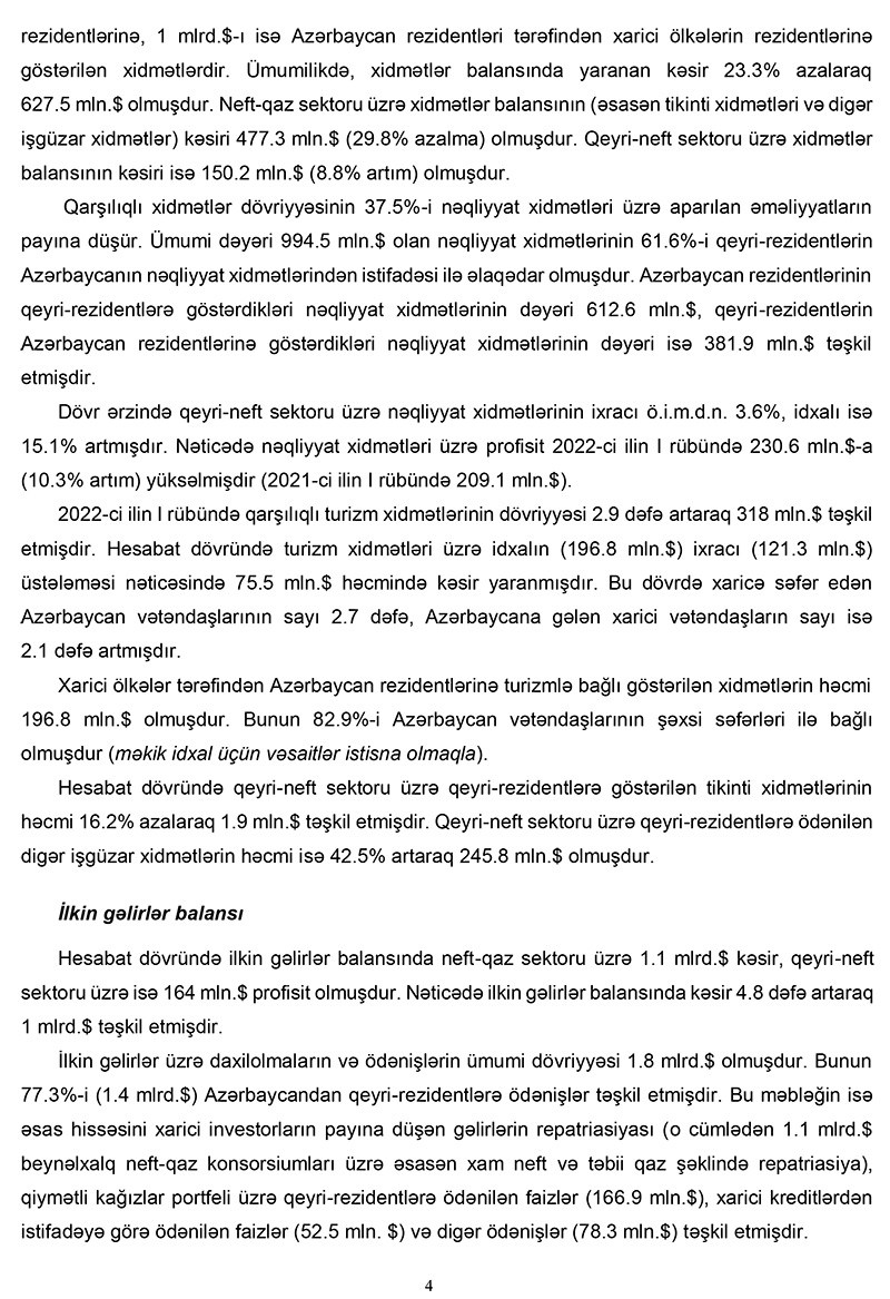 Mərkəzi Bank qeyd edib ki, 2022-ci ilin 1-ci rübündə tədiyə balansı əsasən qlobal əmtəə bazarlarında neft-qaz qiymətlərinin və qeyri-neft ixracının əhəmiyyətli artımından təsirlənmişdir. Cari əməliyyatlar balansında 4 milyard dollar profisit, kapital və maliyyənin hərəkəti hesabında isə 1.2 milyard dollar kəsir yaranmış, ehtiyat aktivləri təxminən 1.6 milyard dollar artmışdır.