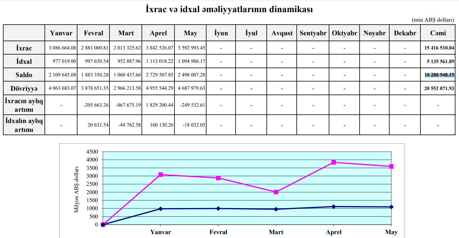2022-ci ilin ilk 5 ayında (yanvar-may dövründə) Azərbaycanın xarici ticarət əməliyyatlarının həcmi 20 milyard 552 milyon 72 min ABŞ dolları təşkil edib.
