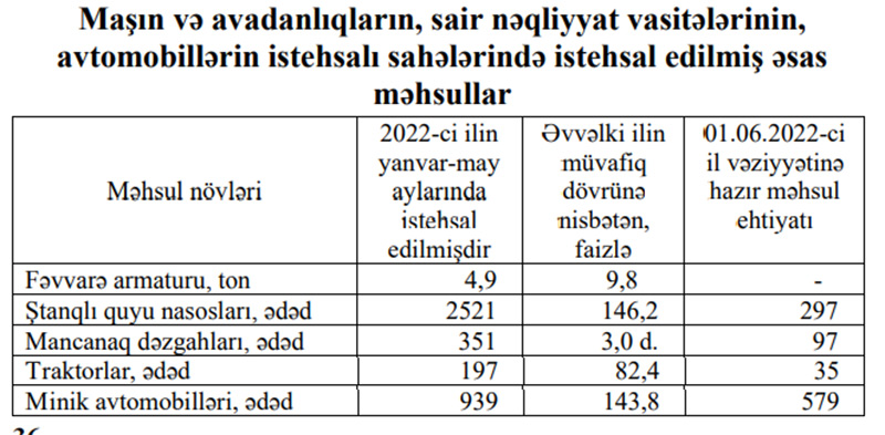 Dövr ərzində əvvəlki ilin müvafiq dövrü ilə müqayisədə traktorların istehsalı 17,6 faiz azalaraq 197 ədəd təşkil edib. 01.06.2022-ci il vəziyyətinə hazır məhsul ehtiyatı 35 ədəd olub.