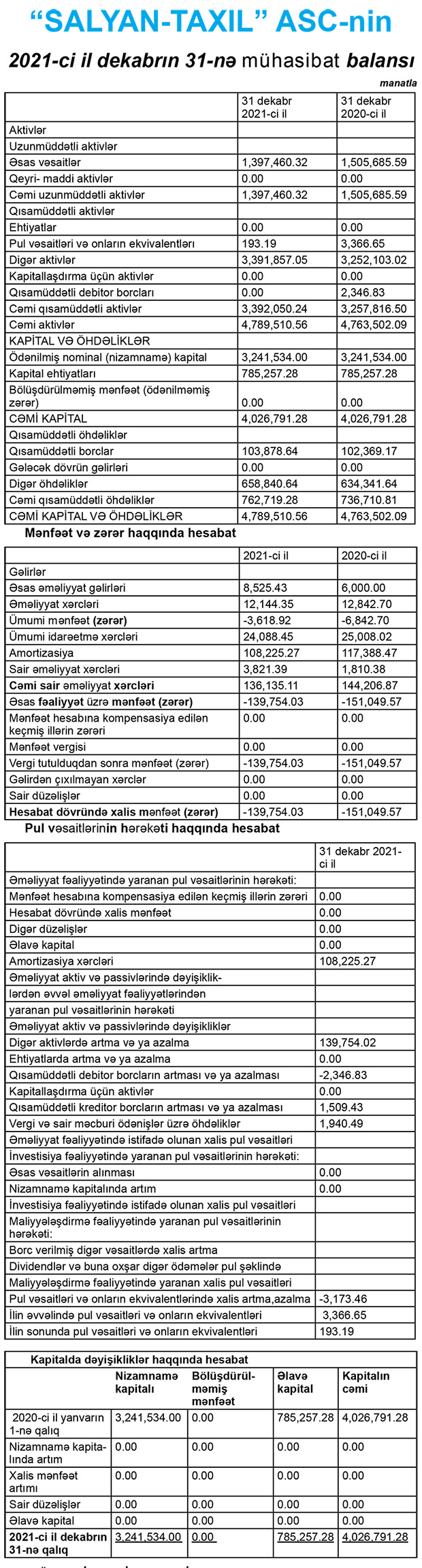 "Salyan-Taxıl" ASC 2021-ci ili 140 min manat yaxın xalis zərər ilə başa vurub. ASC 2020-ci ili 151 min manat xalis zərər ilə bağlamışdı.