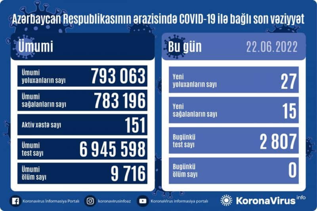 Azərbaycan Respublikasında koronavirus (COVID-19) infeksiyasına 27 yeni yoluxma faktı qeydə alınıb, 15 nəfər müalicə olunaraq sağalıb.