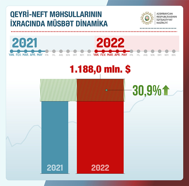 İqtisadiyyat naziri Mikayıl Cabbarov bildirib ki, bu ilin yanvar-may aylarında qeyri-neft məhsullarının ixracı əvvəlki ilin müvafiq dövrünə nisbətən 30,9% artaraq 1 milyard 188 milyon dollar təşkil edib.