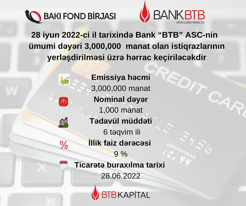 Birjanın yaydığı məlumata görə, 28 iyun 2022-ci il tarixində Bank “BTB” ASC-nin istiqrazların yerləşdirilməsi Bakı Fond Birjasında birqiymətli hərrac üsulu ilə həyata keçiriləcəkdir.