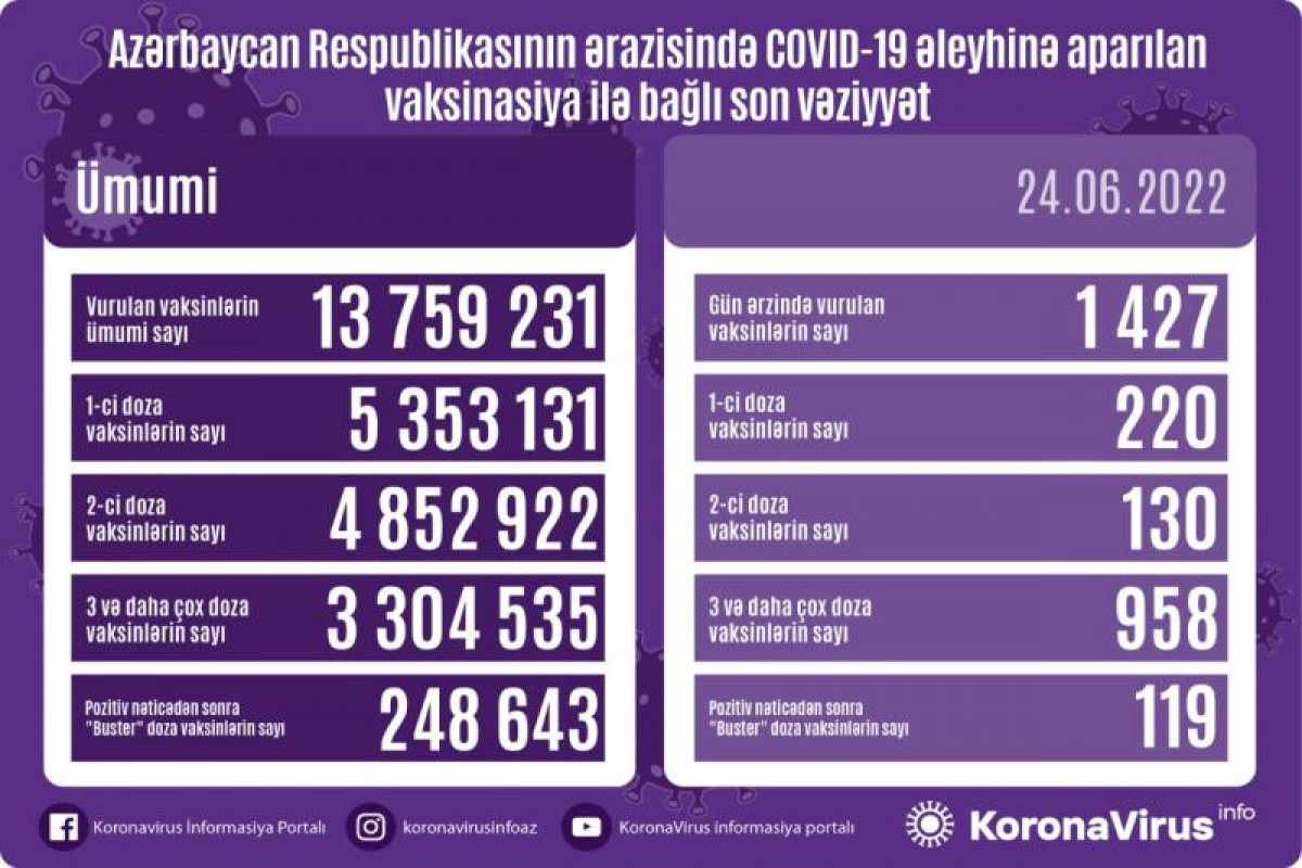 Azərbaycanda son sutkada koronavirus (COVID-19) əleyhinə 1427 vaksin vurulub. Bir gündə birinci mərhələ üzrə vaksinasiya olunanların sayı 220, ikinci mərhələ üzrə vaksinasiya olunanların sayı 130, üç və daha çox doza üzrə vaksinasiya olunanların sayı 958, pozitiv nəticədən sonra buster doza üzrə vaksinasiya olunanların sayı 119 nəfərdir.
