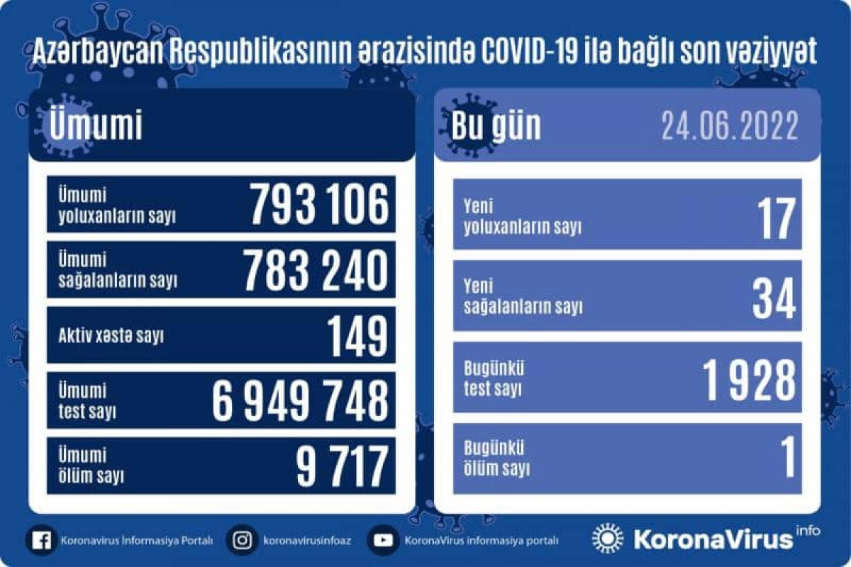 Azərbaycan Respublikasında koronavirus (COVID-19) infeksiyasına 17 yeni yoluxma faktı qeydə alınıb, 34 nəfər müalicə olunaraq sağalıb.