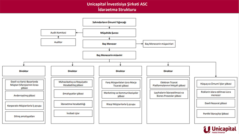 Beləliklə, “Unicapital İnvestisiya Şirkəti” ASC-nin yeni təşkilatı strukturuna əsasən, icraedici idarəetmə Baş Menecer, Direktorlar və şöbə rəhbərlərinin daxil olduğu kollegial orqan olan İcra Komitəsi üzərindən təşkil edilir.