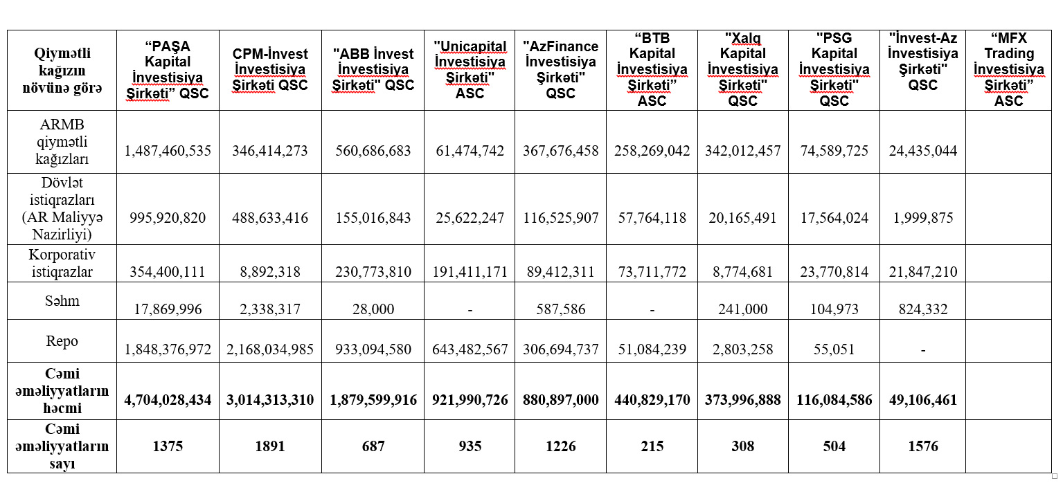 Marja Birjaya istinadən xəbər verir ki, 2022-ci ilin yanvar-iyun ayları üzrə “PAŞA Kapital İnvestisiya Şirkəti” 4 milyard 704 milyon 28 min manat dövriyyə ilə 1-ci, CPM-İnvest İnvestisiya Şirkəti QSC 3 milyard 14 milyon 313 min manat dövriyyə ilə 2-ci, "ABB İnvest İnvestisiya Şirkəti" QSC 1 milyard 879 milyon 600 min manat dövriyyə ilə 3-cü yeri tutub.