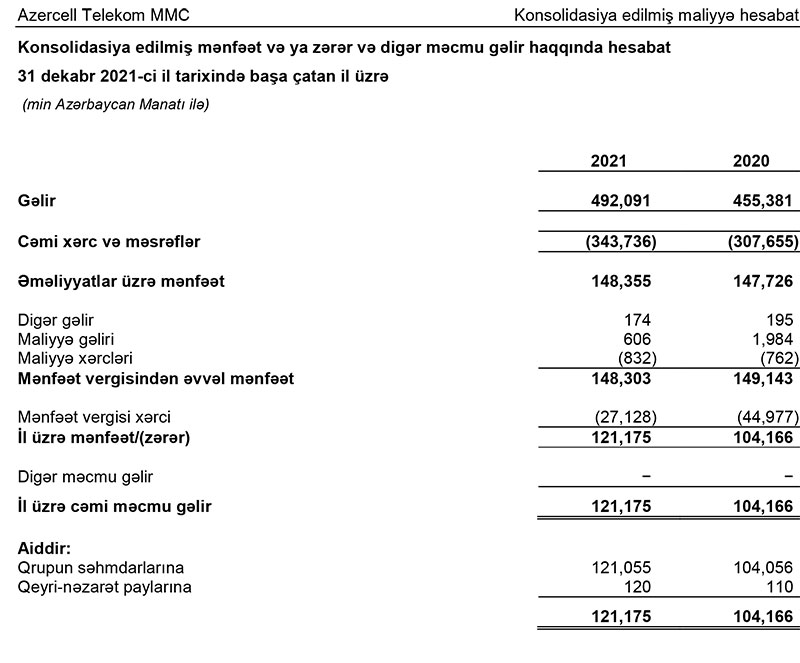 Şirkət hər gün orta hesabla 1 milyon 348 min manat gəlir əldə edib."Azercell Telekom" MMC 2021-ci ili 121 milyon 175 min manat xalis mənfəət ilə başa vurub. Halbuki, Şirkət 2020-ci ili 104 milyon 166 min manat xalis mənfəət ilə bağlamışdı. Beləliklə, 2020-ci illə müqayisədə 2021-ci ildə "Azercell Telekom"un xalis mənfəəti 17 milyon 9 min manat və ya 16,3% artıb.