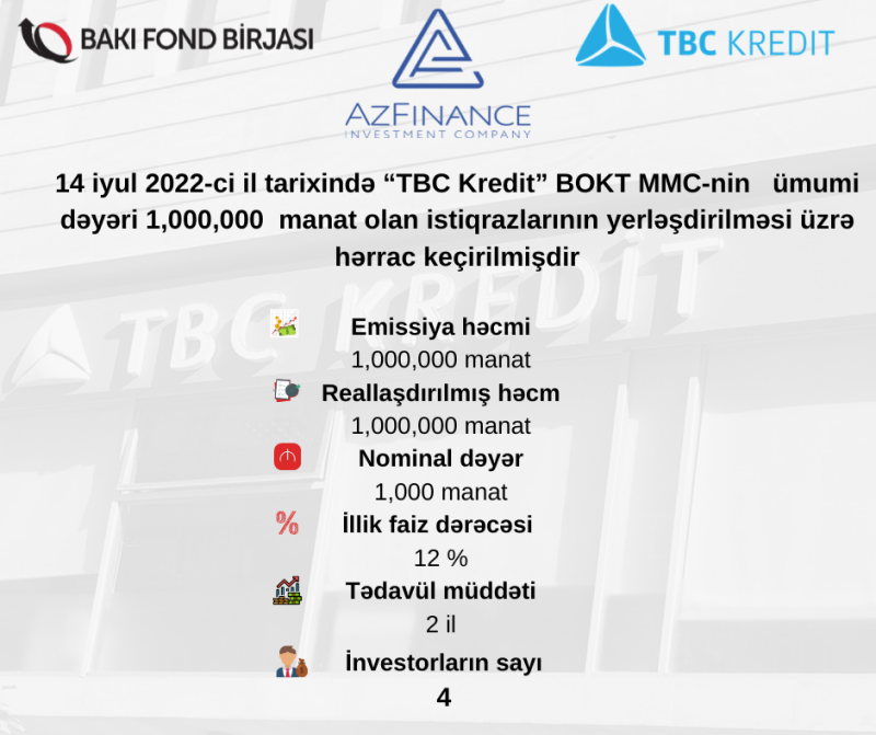 14 iyul 2022-ci il tarixində Bakı Fond Birjasında “TBC Kredit” BOKT MMC-nin tədavül müddəti 2 (iki) təqvim ili olan AZ2006019163 dövlət qeydiyyat nömrəli, 1 milyon manat həcmində, faizli, təmin edilməmiş sənədsiz, adlı istiqrazlarının yerləşdirilməsi üzrə hərrac yekunlaşıb.