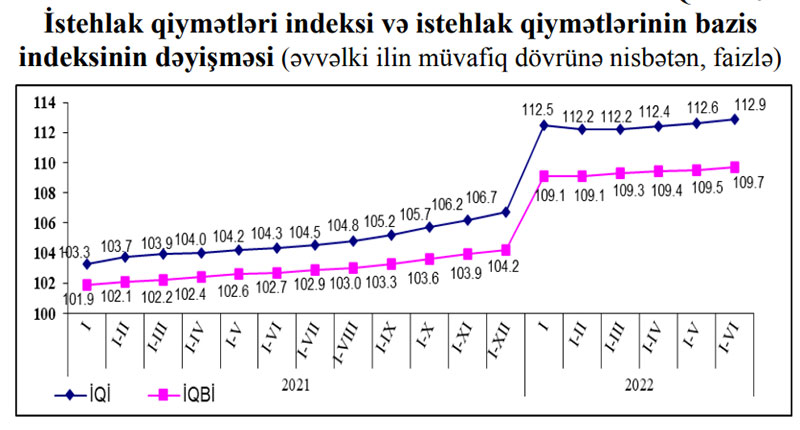2022-ci ilin iyun ayında istehlak qiymətləri indeksi (inflyasiya göstəricisi) may ayı ilə müqayisədə 0,1 faiz azalıb, 2022-ci ilin yanvar-iyun aylarında əvvəlki ilin müvafiq dövrü ilə müqayisədə isə 12,9 faiz artıb.